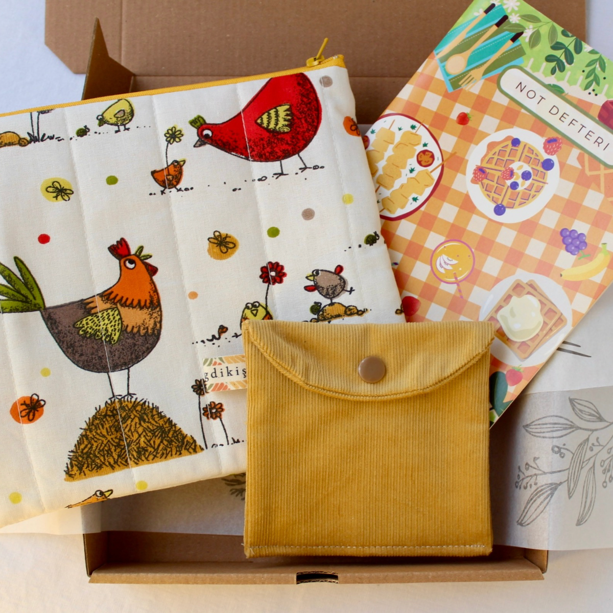 Günlük kullanım için hem pratik hem de özel bir hediye alternatifi. Tavuk desenli fermuarlı çok amaçlı çanta, kadife mini cüzdan ve çizgisiz planlayıcı & not defterinden oluşan bu hediye seti; çantanızı düzenlemek, küçük eşyalarınızı taşımak ve günlük notlarınızı yazmak için ideal.
