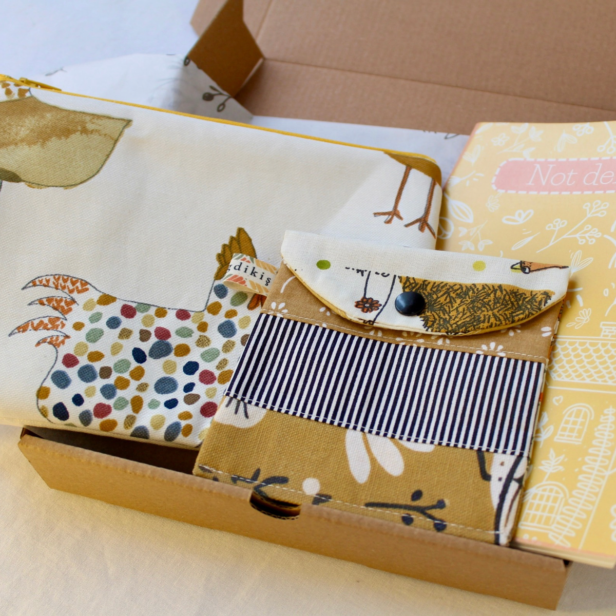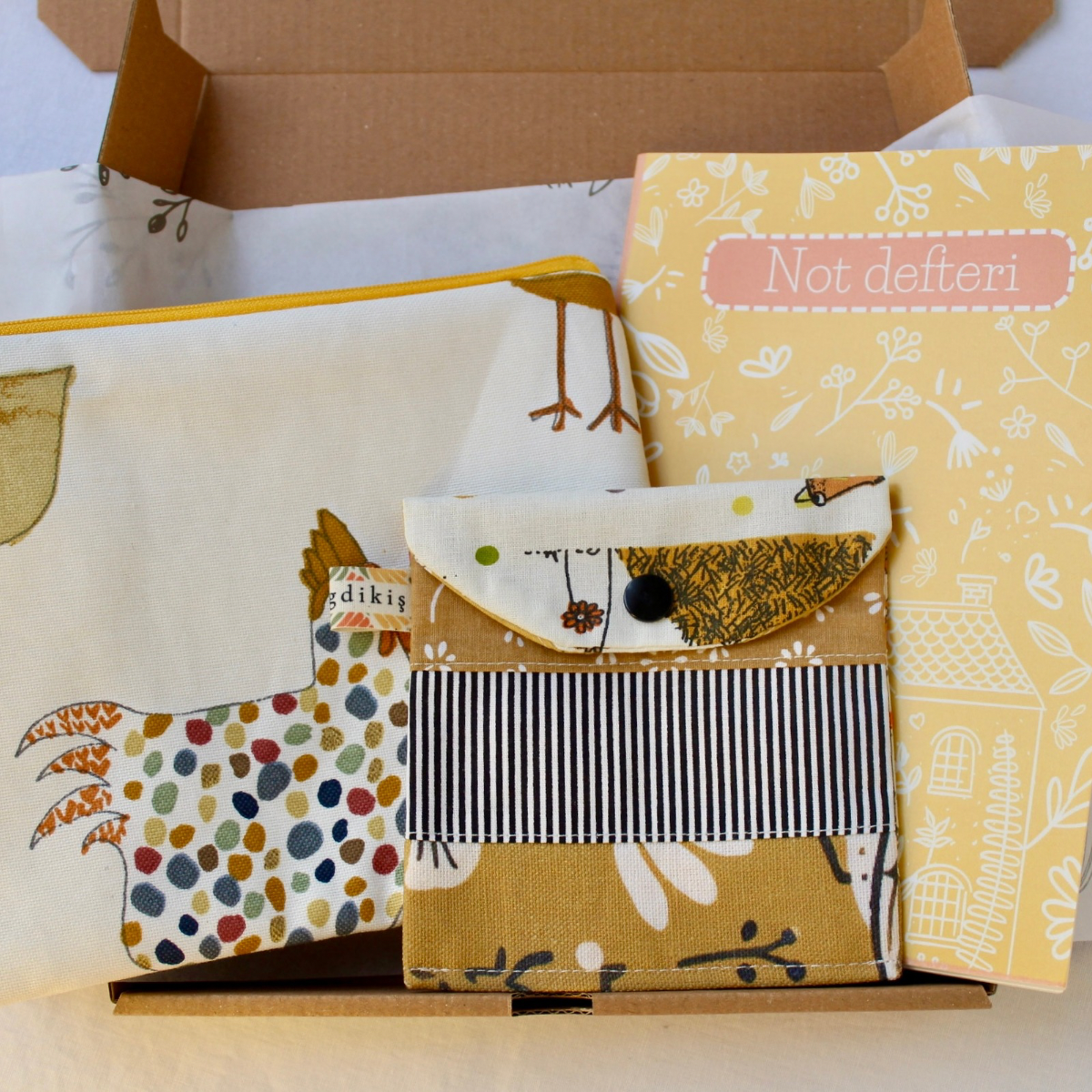 Günlük kullanım için hem eğlenceli hem pratik bir hediye seti. Renkli tavuk desenli fermuarlı çok amaçlı çanta, kırkyama (patchwork) mini cüzdan ve çizgisiz planlayıcı & not defterinden oluşur.