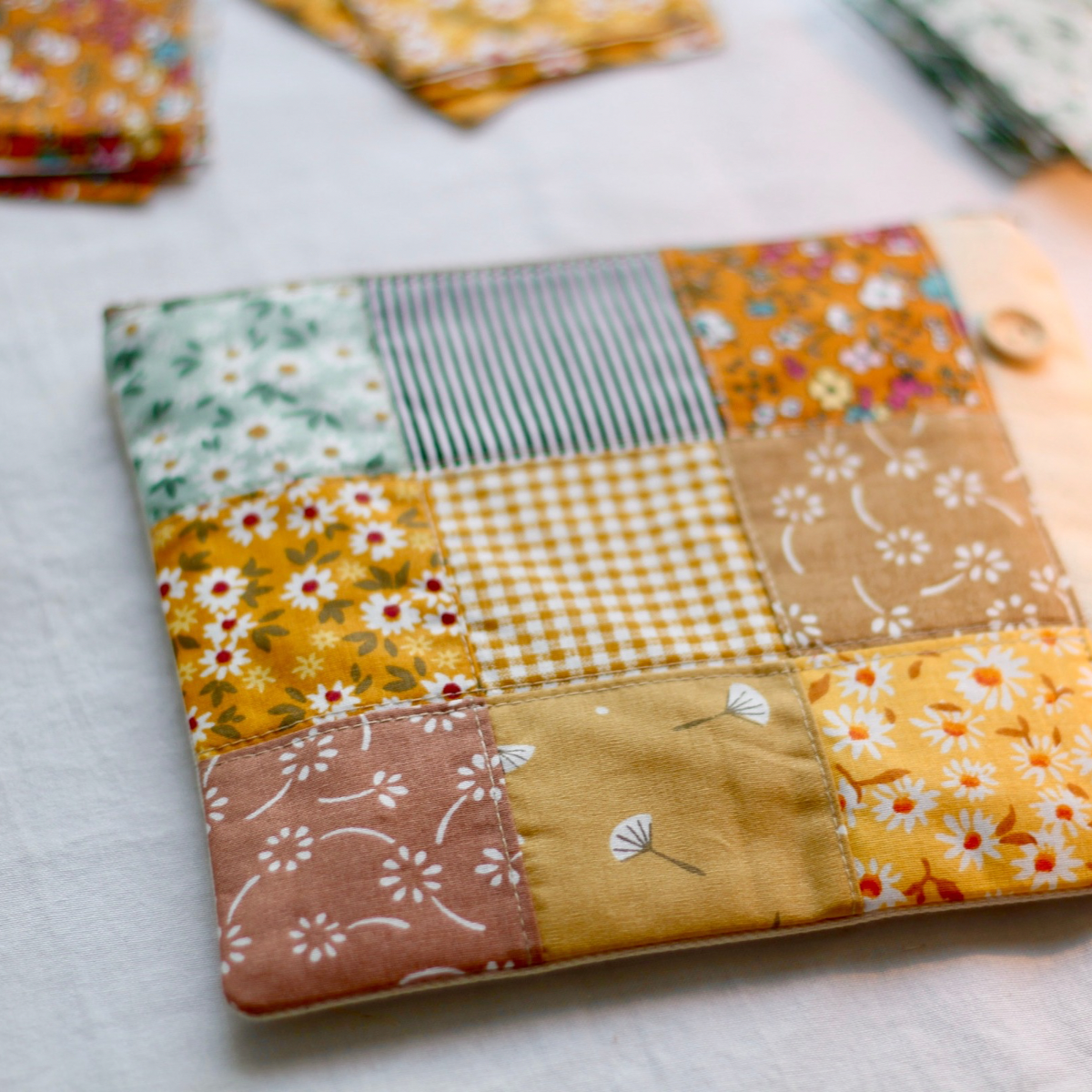 Çiçek desenli pamuklu kumaşların uyumuyla hazırlanan bu patchwork makyaj çantası, sıcak renkleriyle dikkat çeker. El emeği tasarımı sayesinde her biri benzersizdir. Fermuarlı ve dayanıklı yapısıyla makyaj malzemeleri, bakım ürünleri ve küçük aksesuarlar için pratik bir çok amaçlı çanta olarak kullanılabilir.